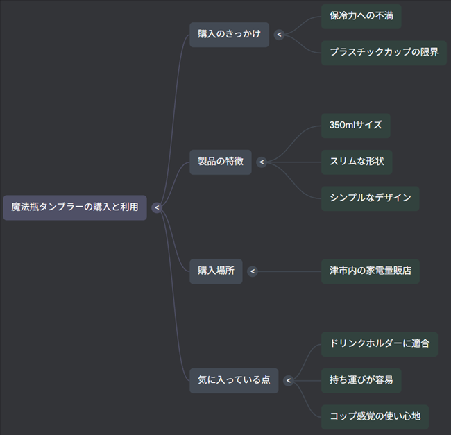 購入のきっかけは、普段使っていたプラスチックカップの保冷力に物足りなさを感じたこと。津市内の家電量販店で見つけたスリムな350mlサイズの魔法瓶タンブラーは、デザインもシンプルで車のドリンクホルダーにもぴったり収まります。持ち歩きも苦にならず、普段使いのコップ感覚で使えるのが気に入っています。