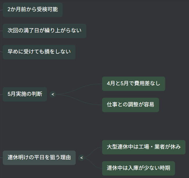 大型連休中は工場や部品業者が休みになることが多く、車検の入庫も少ない時期といわれているため、あえて連休明けの平日を狙うことにしています。