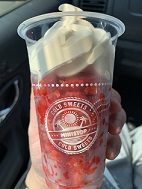 実際に食べてみると、ソフトクリームの上にたっぷりとフローズンいちごがトッピングされていて、かき氷のようなシャリッとした食感と、練乳の甘みがしっかり効いたソフトクリームが相性抜群でした。氷菓でもパフェでもない、新感覚のスイーツという印象です。